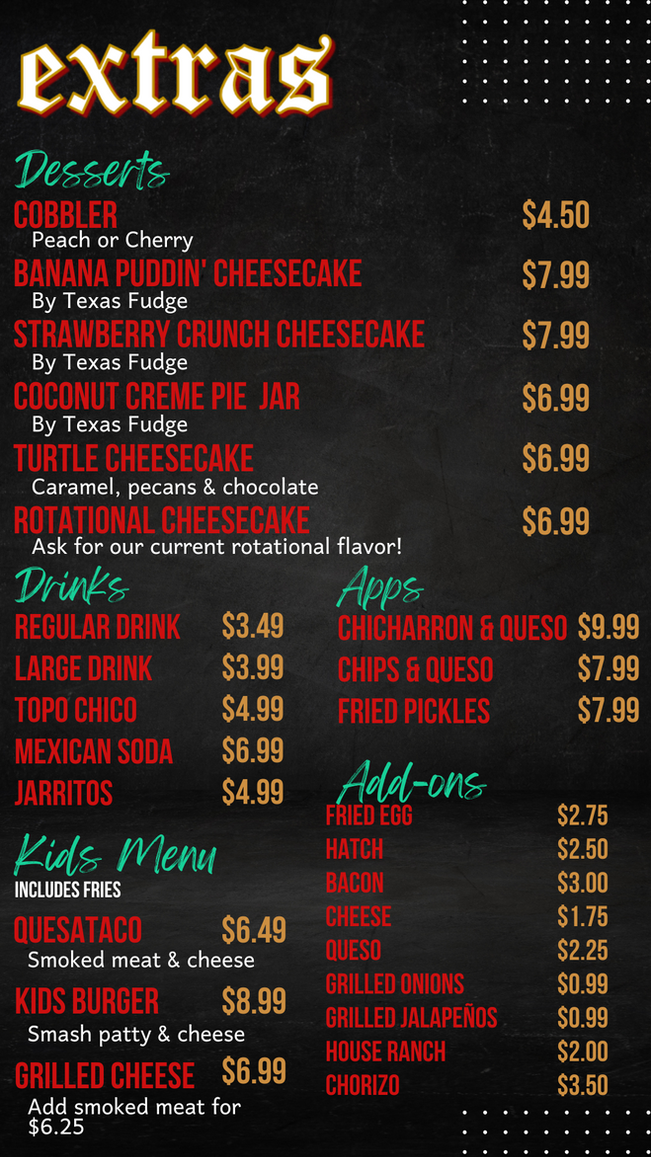 In 2019, Ruben set out to find the perfect truck to start his food business - a dream he had since he was sixteen. He found a 1963 P40 in Las Cruces, NM and started Pachuco Mobile Food Co. Ruben wanted to introduce different flavors from around the world and created a fusion menu consisting of unique burgers, Korean inspired dishes, bao, poutine, and several other dishes. Husband and wife duo, Ruben & Idalia, operated the food truck a few days a month when they weren't working their full-time oilfield jobs. They quickly outgrew the small truck and moved into a 1990 fire department command center. When the opportunity to expand into the oldest restaurant in Midland, the iconic Johnny's Barbecue, presented itself, they had to jump on it. In December of 2022, Pachuco's opened its doors and expanded into the barbecue world while still providing their staple food truck menu.